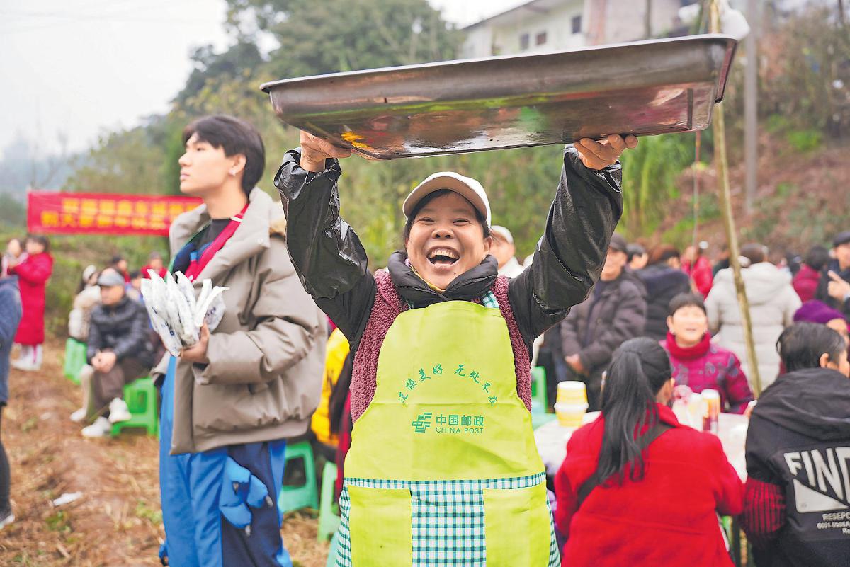 “歡樂不需要舞臺,歡樂就在田坎上!”正如一位網友所說,最熱鬧的還數田壩頭。江津區分公司支起的長條桌上,花椒、臘肉、米花糖擺得滿滿當當。從渝北趕來的李女士嘗了片米花糖:“對了,就是這個老味道。”她隨即掃碼,準備給在廣州工作的女兒寄去一份。