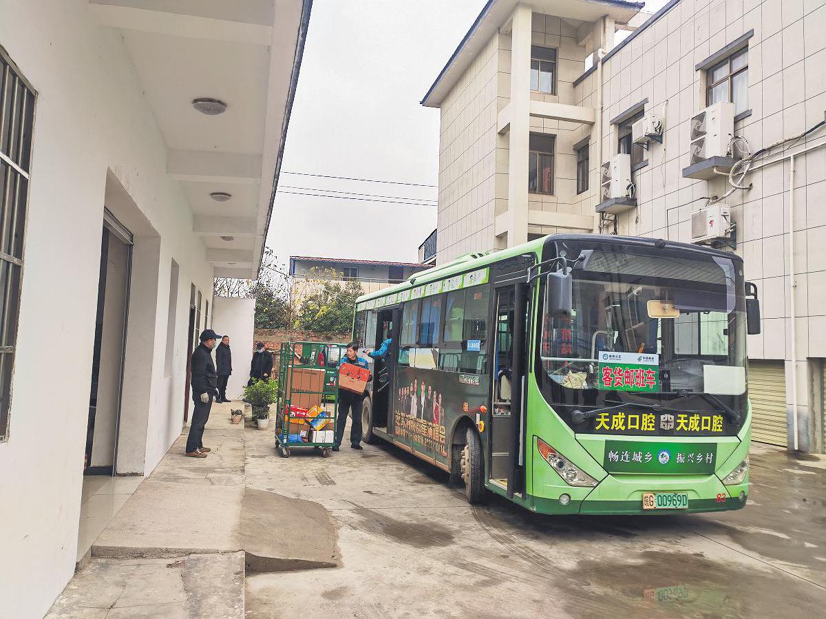 在樅陽縣會宮鎮農村電商運營中心,郵政投遞員卸下公交代運的郵快合作郵件。