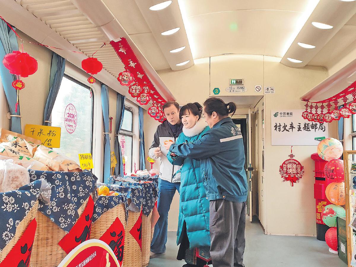 2026年新春,“村火車”迎來“熱鬧中國年·尋味黔東南”“新春年貨鋪”主題活動。“鄉村市集”里村民們擺起小攤,“非遺工坊”里繡娘飛針走線,“流動展演廳”里身著盛裝的侗族小演員們獻上侗族琵琶彈唱。其間,主題郵局郵味濃濃,成為“村火車”的一抹亮色。